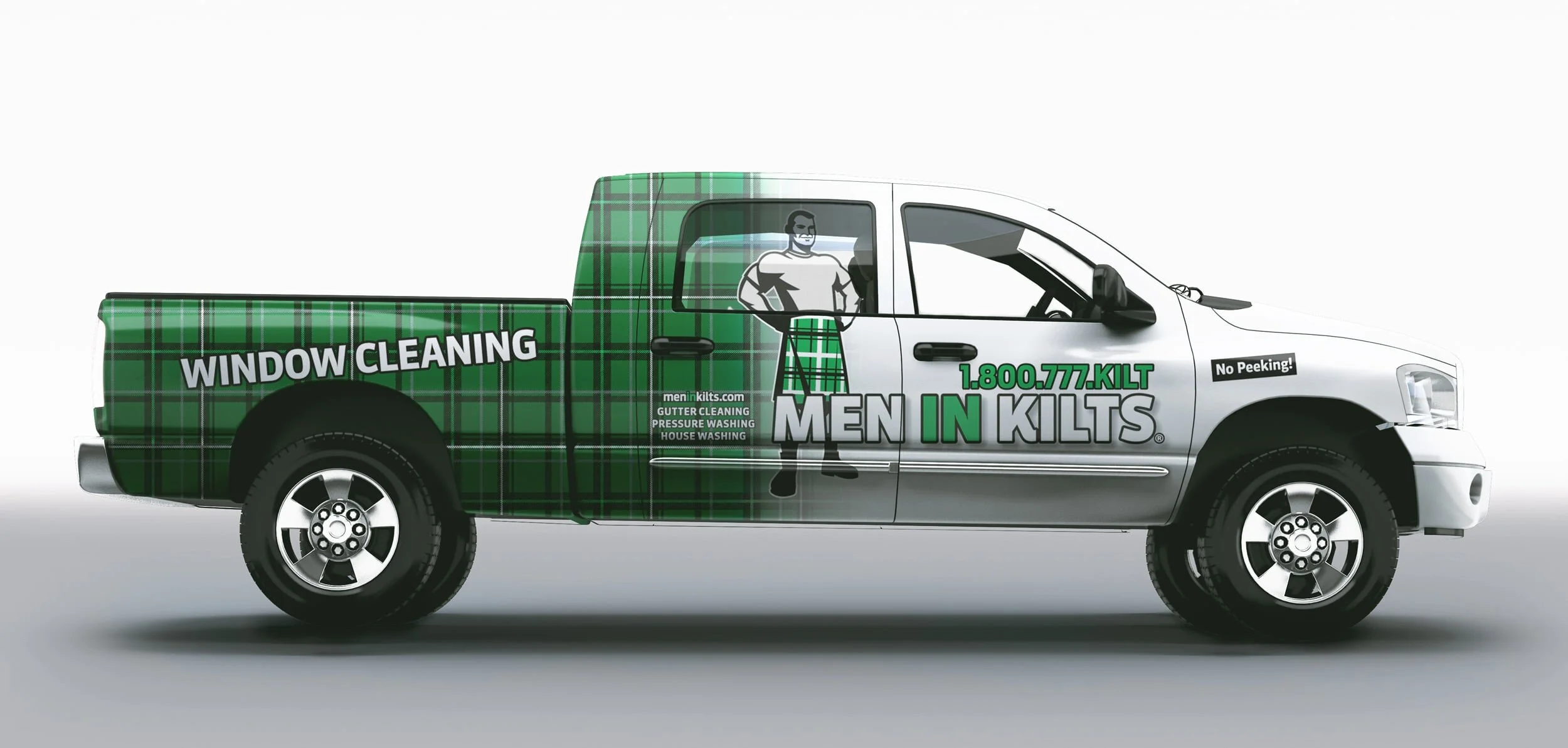 Feature the fun and eye-catching brand of Men In Kilts and promote their cleaning services. The high-contrast lettering and tartan pattern create highly visible marketing for urban and residential areas. All vehicle wraps feature the Men In Kilts mascot, Kiltie, and the catchphrase “No Peeking!”