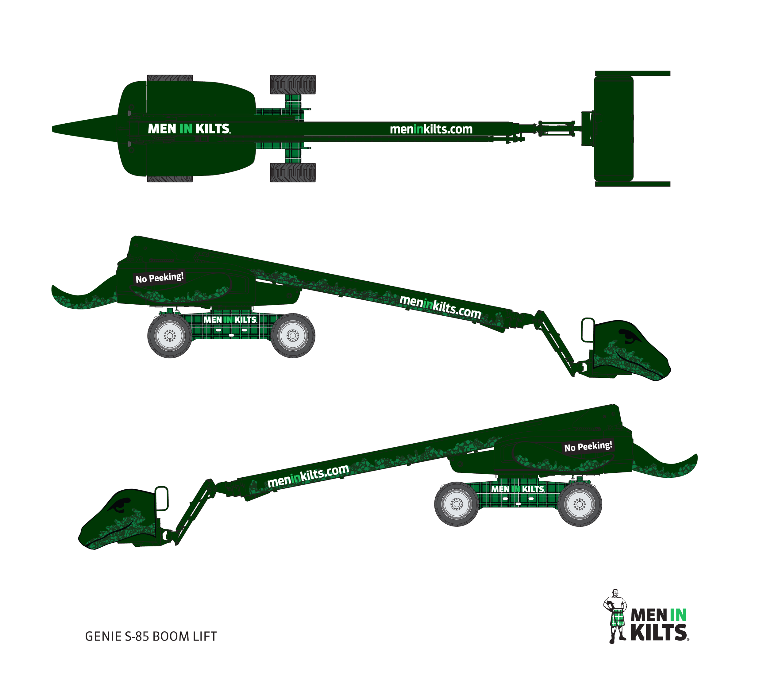 The creative-minded team at Men In Kilts Calgary wanted to wrap a boom lift as a dinosaur, and the kid in me was ecstatic to bring it to life. We were limited in the number of colours and coverage for details, but the contrasting dark and light greens made for a great dinosaur skin texture.