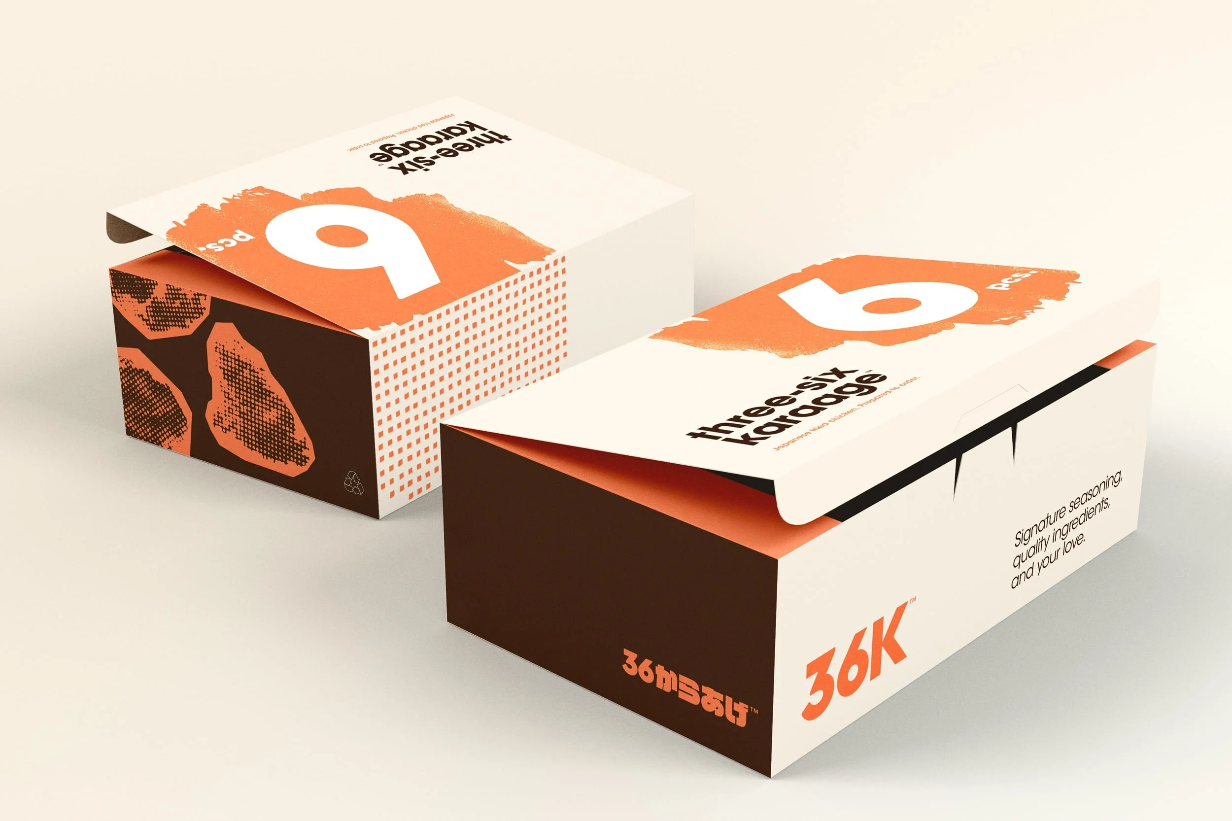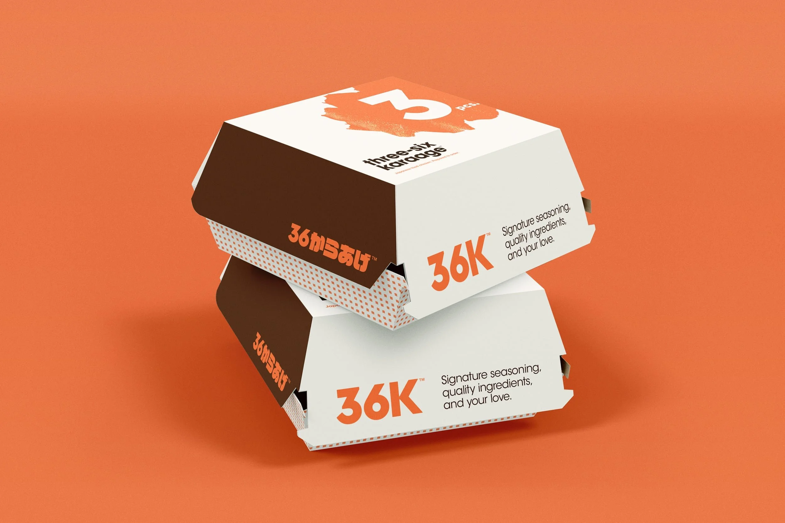 Three-Six Karaage (36K) is a Japanese fried chicken takeaway restaurant. Customers can choose 3- or 6-piece boxes prepared to order. This self-initiated concept is based on the colours, themes, and patterns I saw at similar takeaway restaurants when I lived in Osaka, Japan.